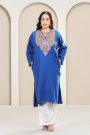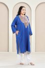 Indulge in refined winter elegance with our Sapphire Blue Kashmiri Woollen Pheran, exquisitely adorned with traditional Tila embroidery. The rich sapphire hue reflects depth and royalty, while the intricate metallic thread work highlights the timeless artistry of Kashmir.