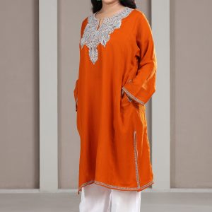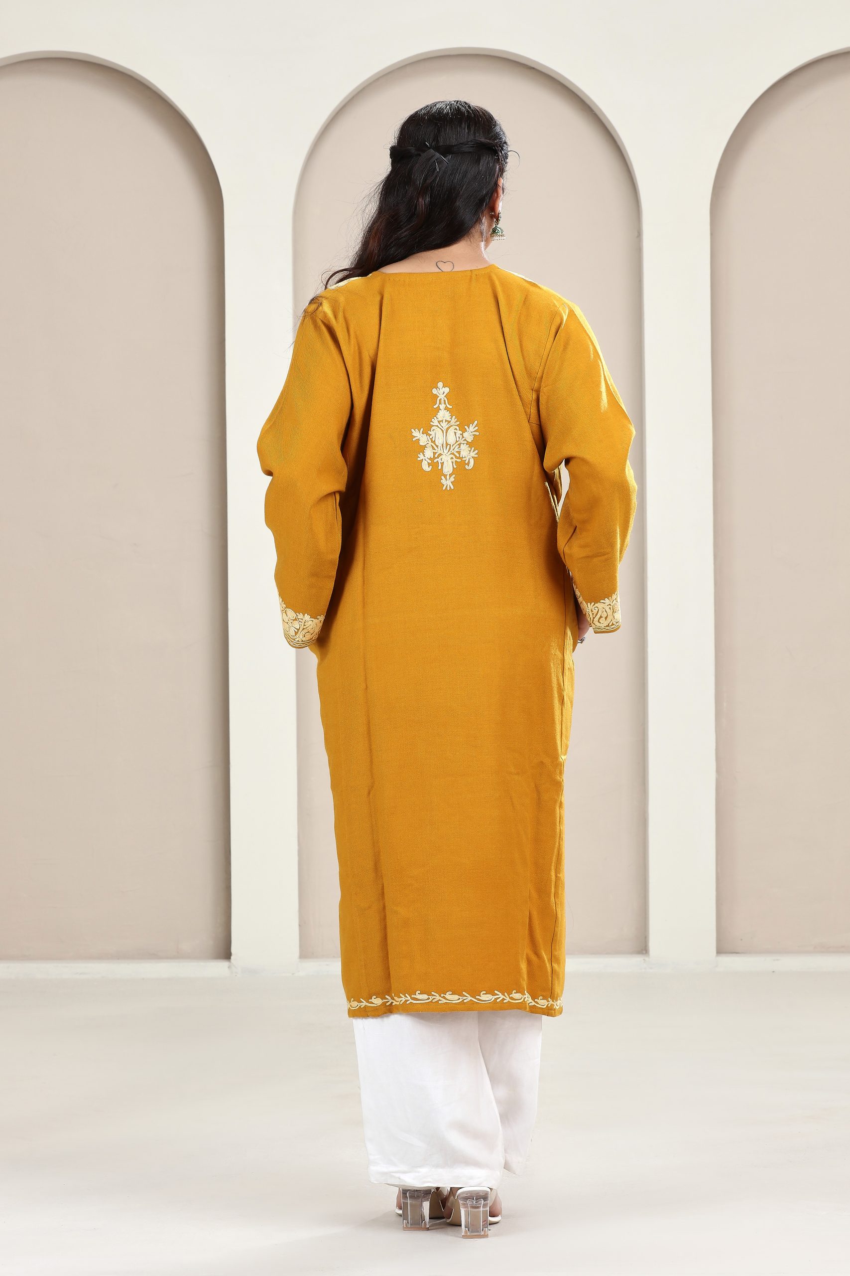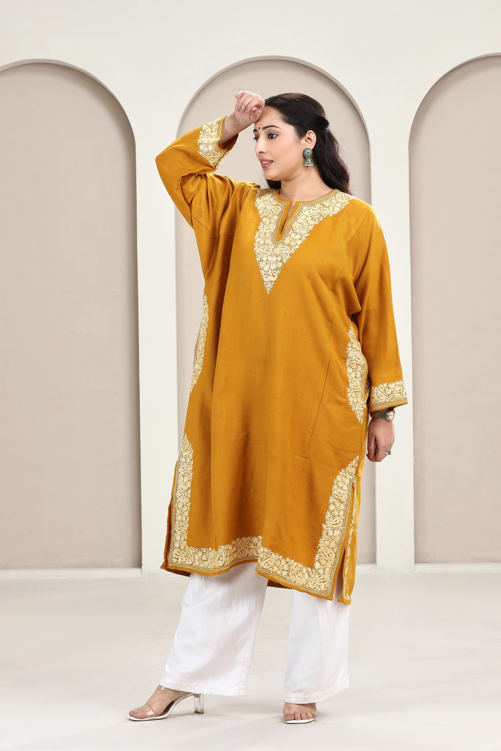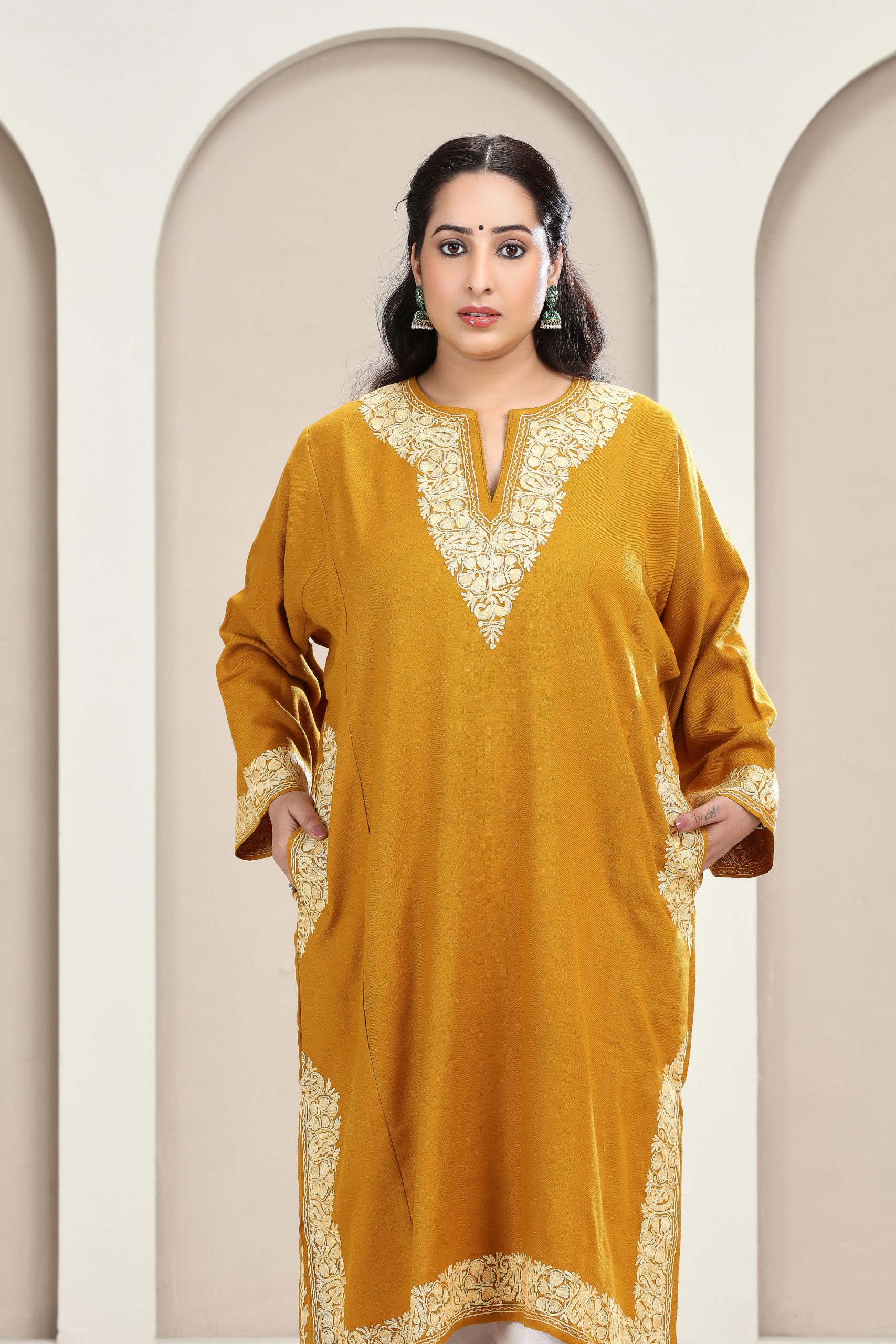 Add timeless charm to your winter wardrobe with this Mustard Yellow Kashmiri woollen pheran, beautifully highlighted with traditional Tila embroidery on the neckline. Crafted from warm, soft woollen fabric, this pheran offers both comfort and elegance.