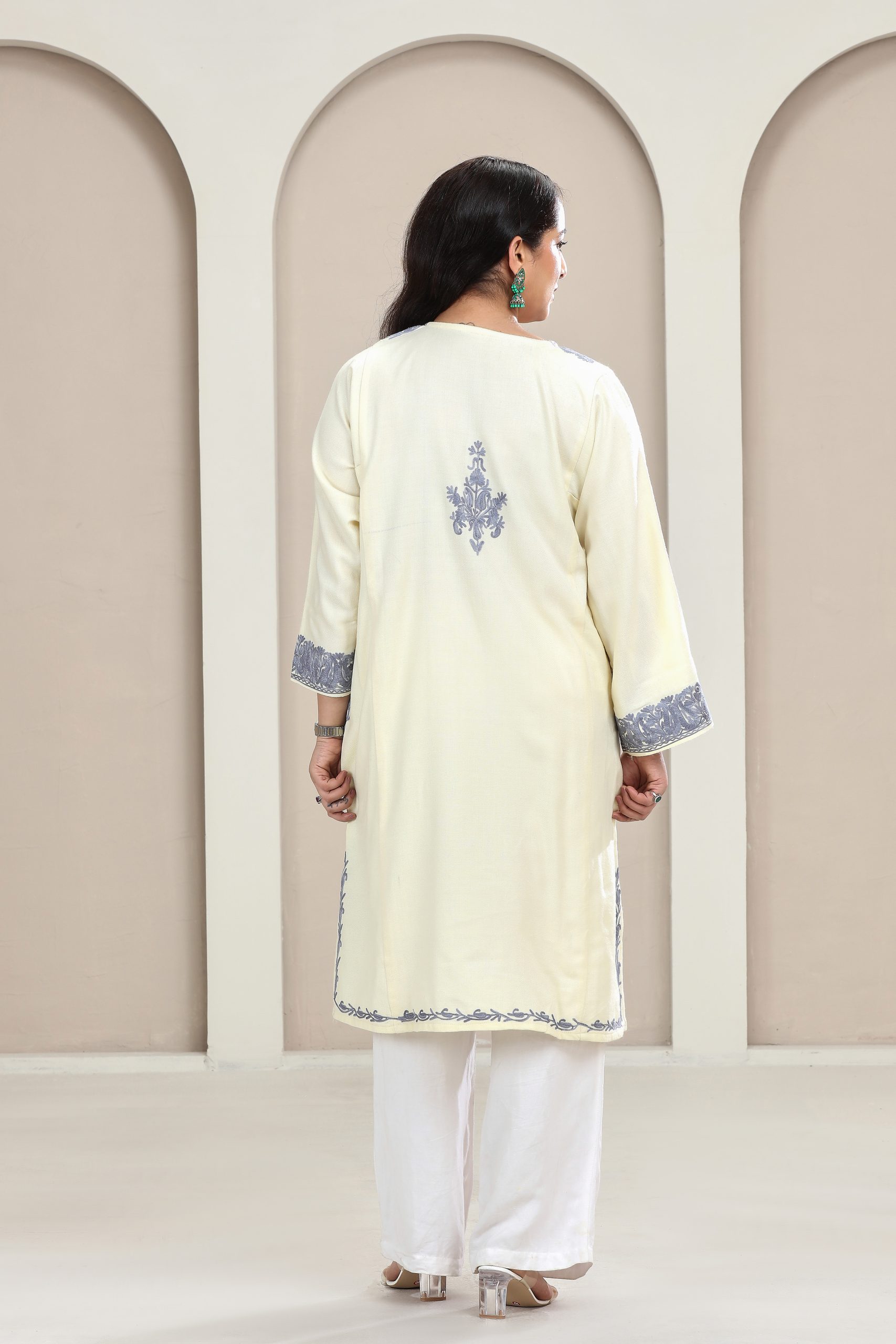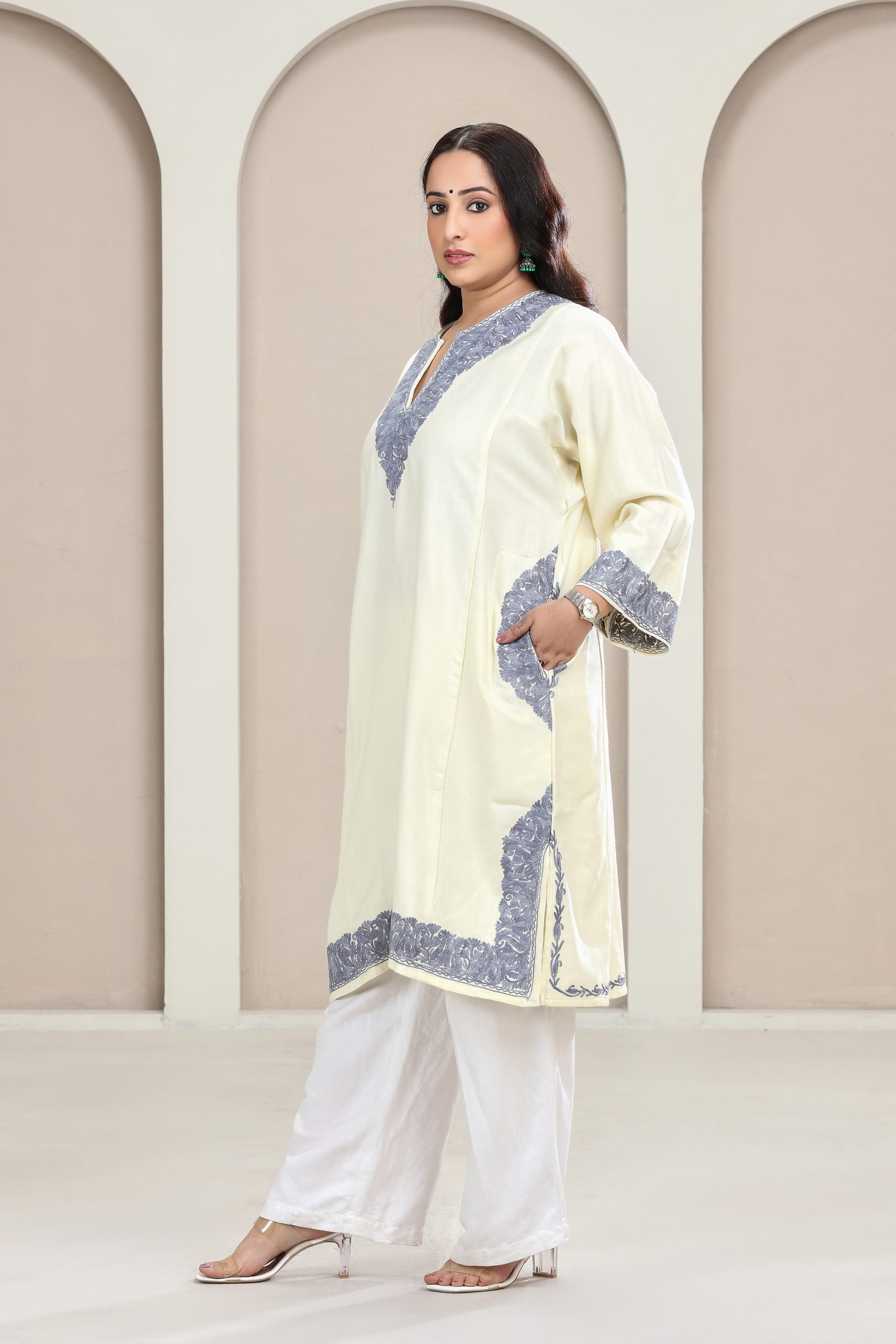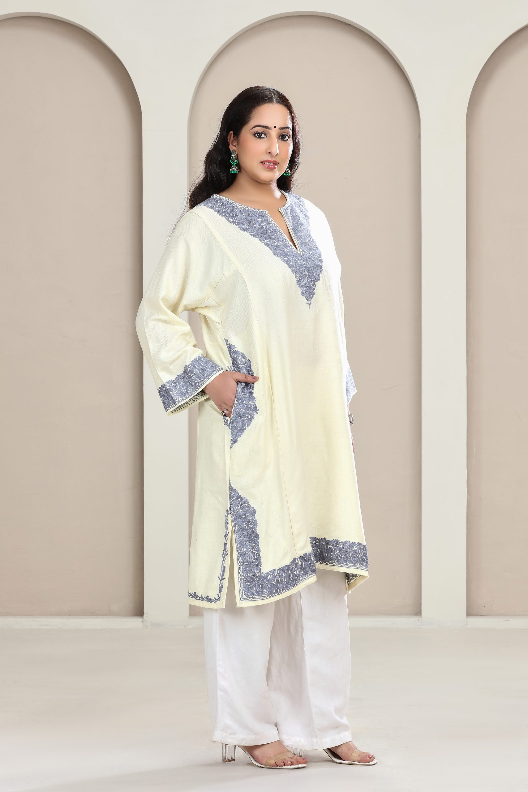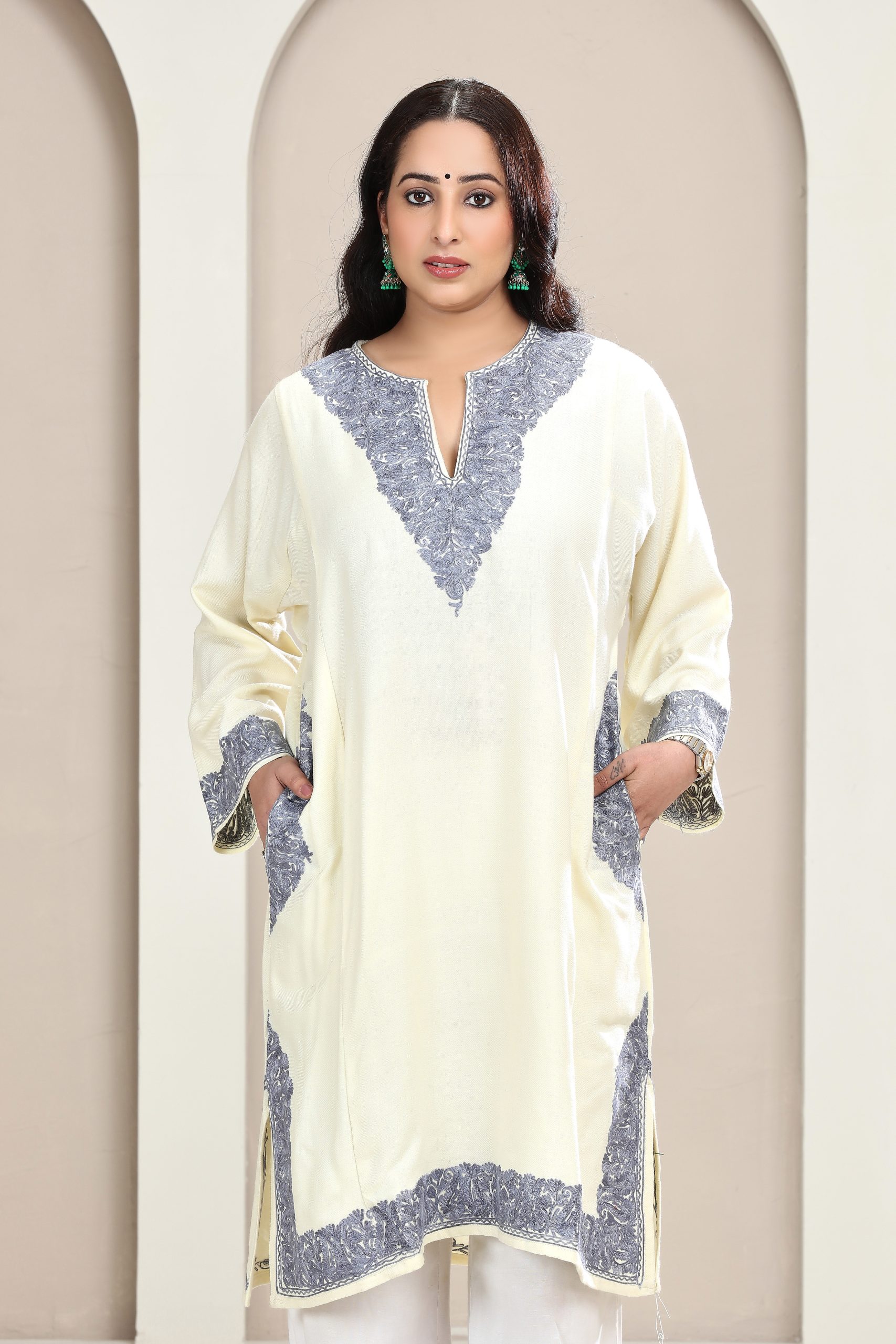 Perfect for winter gatherings, festive occasions, or elegant everyday wear, this pheran pairs beautifully with straight pants or palazzos for a refined Kashmiri look.