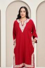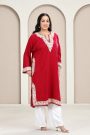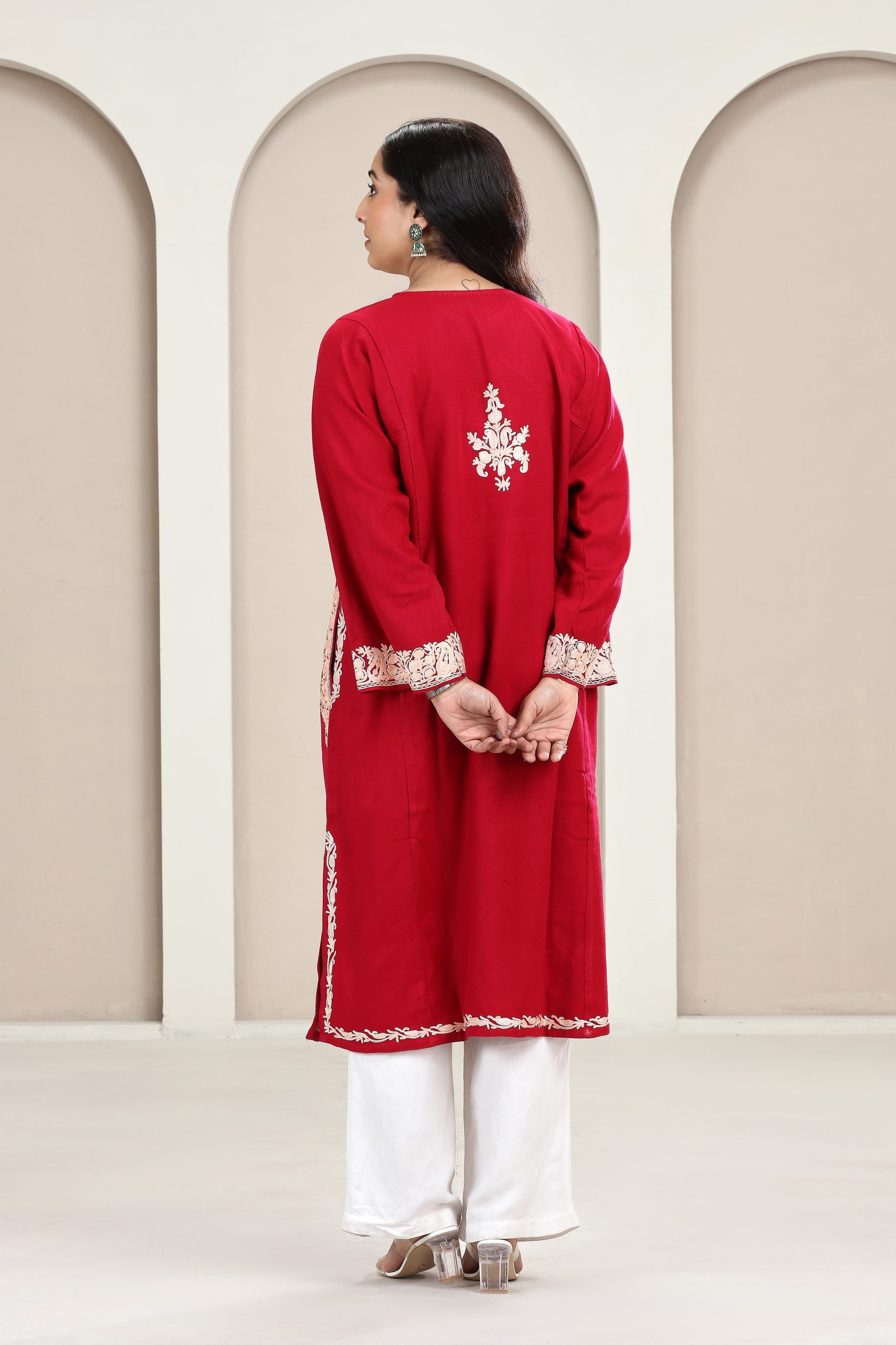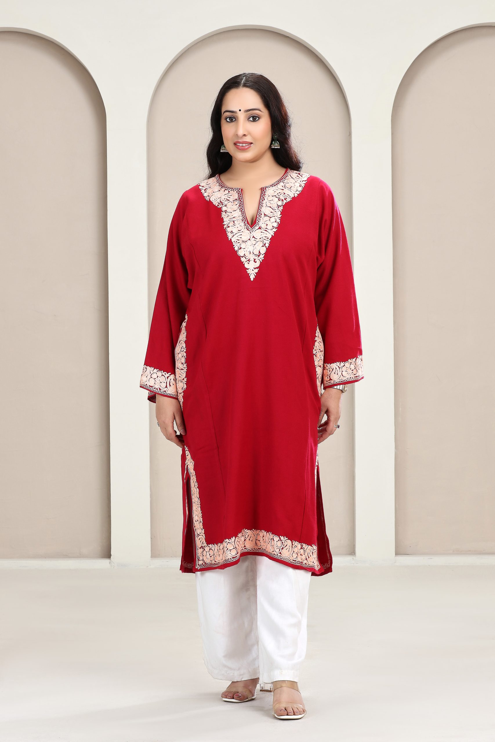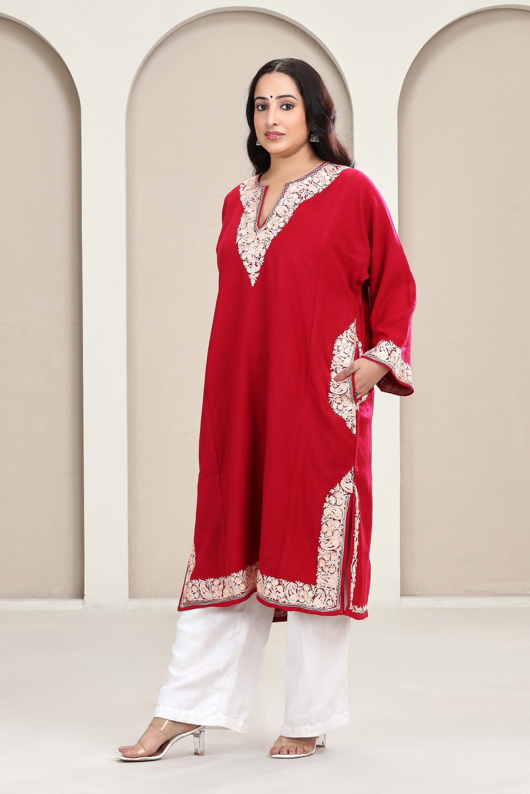 Make a striking winter statement with our Red Kashmiri Woollen Pheran, exquisitely embellished with traditional Tila embroidery. The rich red hue symbolizes celebration and grace, while the intricate metallic thread work reflects the timeless artistry of Kashmir.